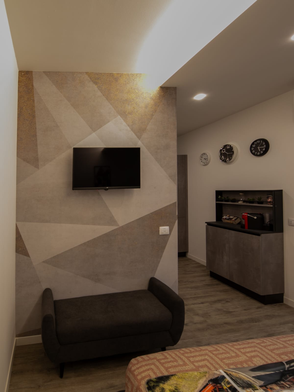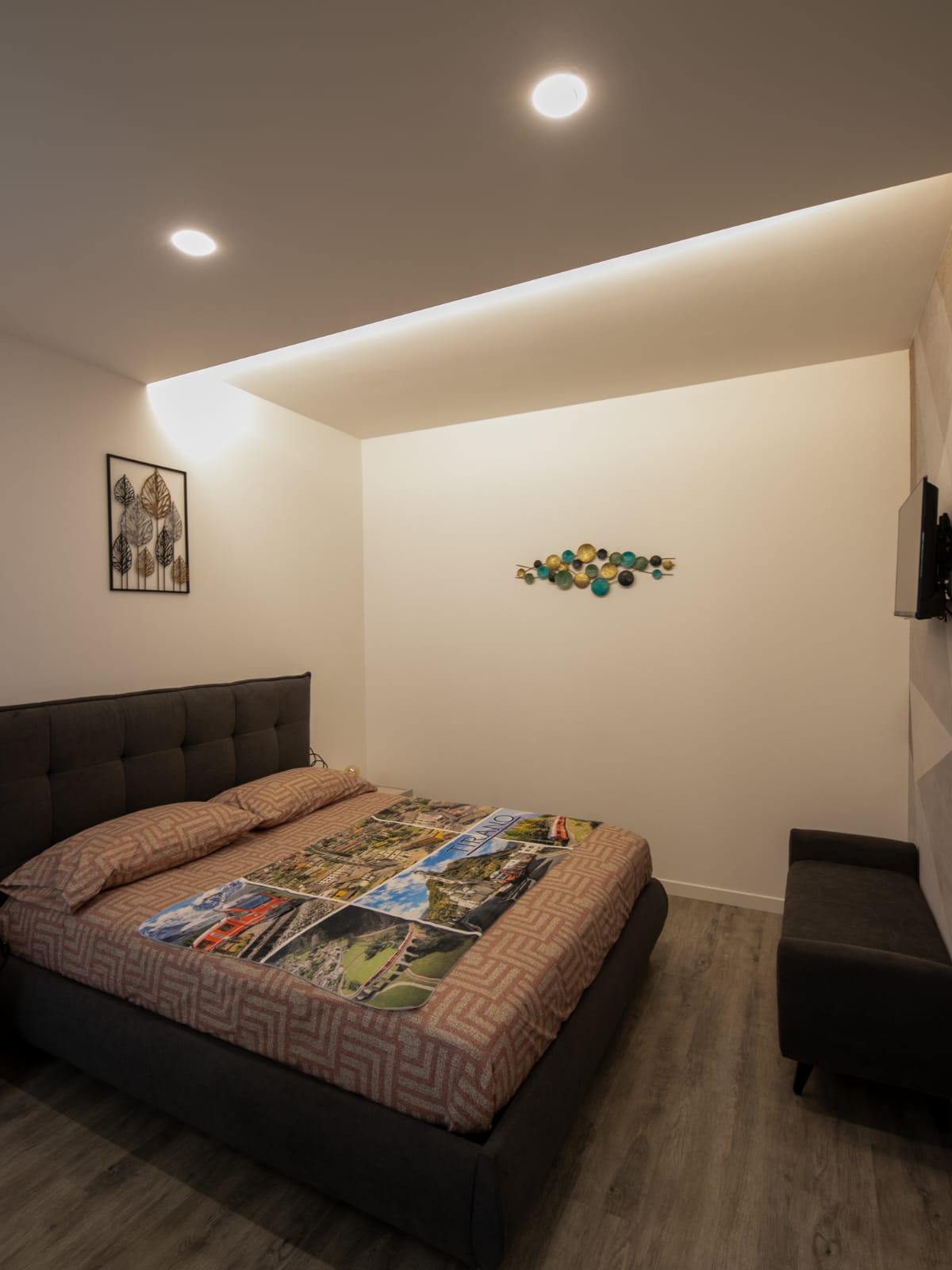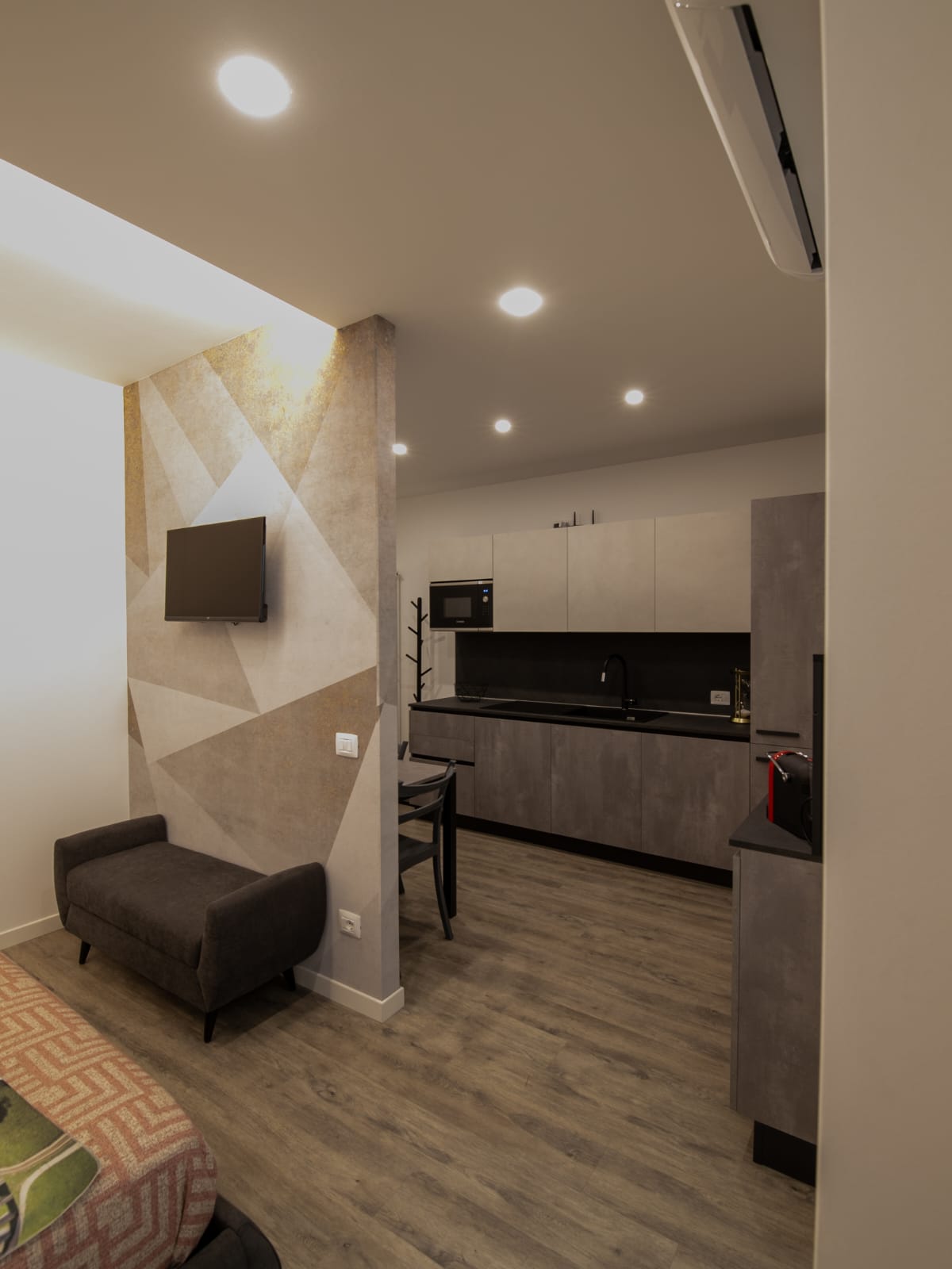 📺 Media & Living= Flat-screen TV. A power outlet is conveniently located near the bed.