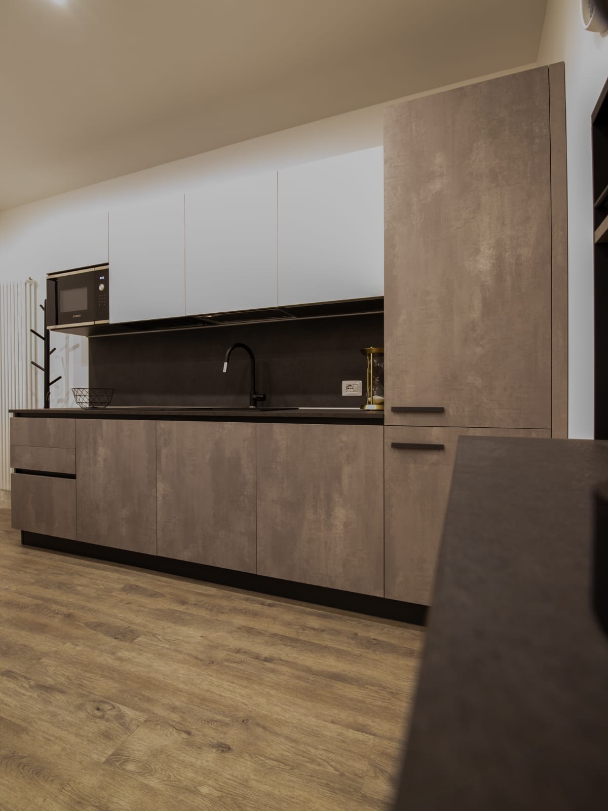 Appliances include: refrigerator, microwave, electric kettle, toaster, coffee machine, and juicer.